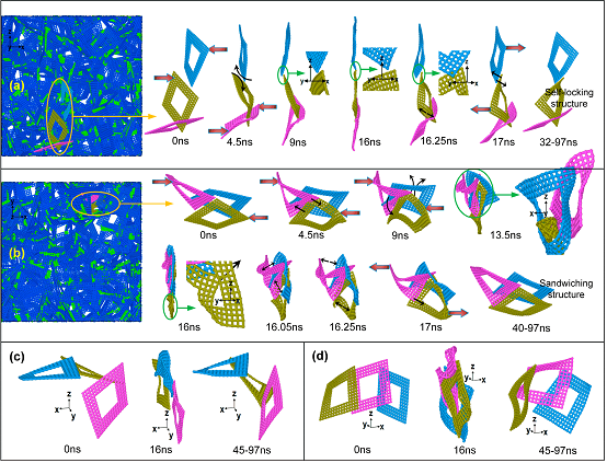 图2:超压缩与回复过程中,局部微结构动力学演化细节及其蕴含的介观机械互锁现象