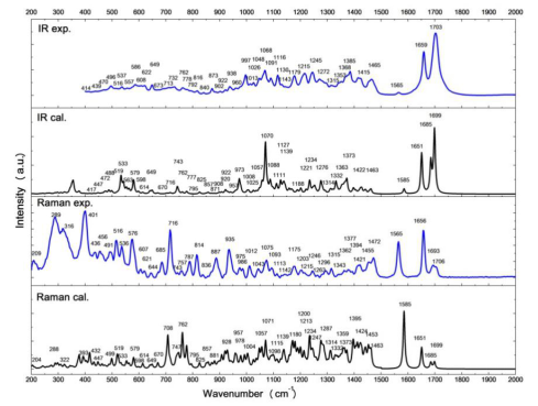 图2 灵芝酸A的实验检测(蓝)和DFT(黑)模拟的红外和拉曼光谱