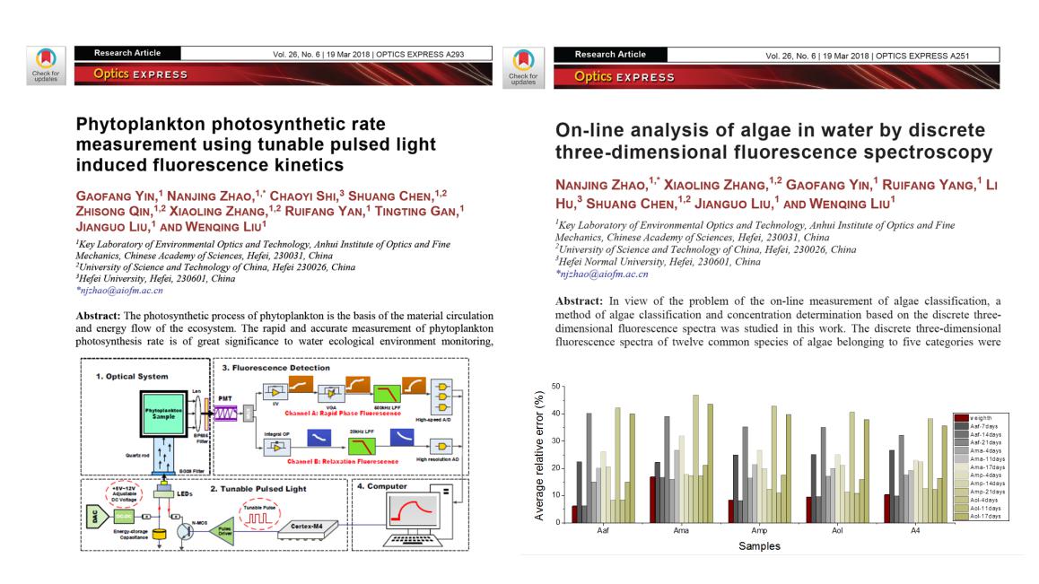 在海水叶绿素在线测量方面,科研人员研究出基于三维荧光光谱方法的海洋浮游植物识别测定与叶绿素分类测量方法,开发了海水叶绿素微弱荧光信号检测等核心技术,在国际上首次设计了基于离散三维荧光光谱方法的水下原位测量仪器,相比于现有测量手段,其精度更高。在海洋初级生产力测量方面,科研人员研究出浮游植物光合作用荧光参数、光合作用速率、有效光合反应中心浓度等要素的荧光动力学测量与反演方法,研发出光合电子传递过程可变光脉冲调控、快相和弛豫荧光动力学信号检测等关键技术,初步建立了海洋初级生产力荧光动力学测量模型,在国内首次设计了基于荧光动力学方法的水下原位测量仪器。此外,科研人员还开发了基于荧光寿命的海水溶解氧时域检测方法及两点积分式荧光寿命快速检测技术。
