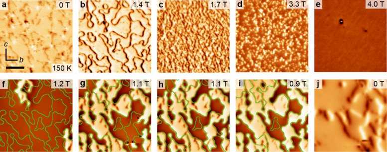 变磁场MFM测量结果。样品首先零场冷却到150 K,(a-e)为之后的升场过程,随着磁场的增加,铁磁相增多并且逐渐占据了整个样品。(f-j)为降场过程,电荷有序相从铁磁相中析出,但其生长被畴壁严格限制。
