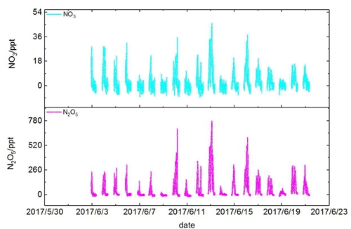 同步测量的NO3和 N2O5 浓度序列。