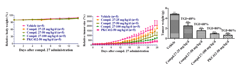 CHMFL-FLT3-335(compound 27)对MV4-11肿瘤细胞小鼠模型的抑瘤作用