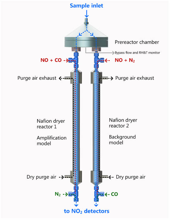 环境湿度的严重影响是PERCA技术外场应用的瓶颈问题。2018年,团队赵卫雄研究员、阳成强等人发展了一种基于Nafion干燥管进样的双通道RO2*测量新技术,大气样品经Nafion干燥管干燥后进入特氟龙反应放大腔,实现RO2*的高灵敏度探测,验证了该解决思路的可行性。