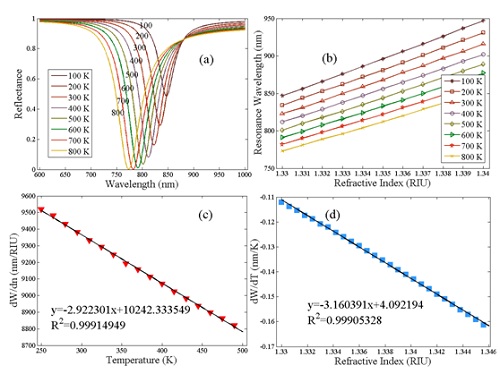 针对以上问题,研究人员提出了一般性解决方案:分别建模分析了角度调试和波长调制模式下的温度对其共振偏移的影响。由于色散效应,两种调制模式下的影响即具有相同的趋势,也有不同之处。基于交叉灵敏度矩阵思想,分别提出了双波长检测(Angular-interrogation)和双角度检测(wavelength-interrogation)方法,实现了折射率和温度变化的同时测量。研究人员首次提出分区间线性修正提高精度的检测思想,且进行了概念性验证实验。相比于构建新型微纳检测结构,该方法在工程领域具有较强的可行性,具有广泛的应用前景,得到了审稿专家的充分肯定。