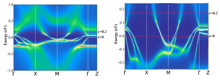 图. (Li1-xFex)OHFeSe动量分辨的谱函数(DFT + DMFT结果),左(右)图结果不包括(包括)自旋-轨道耦合