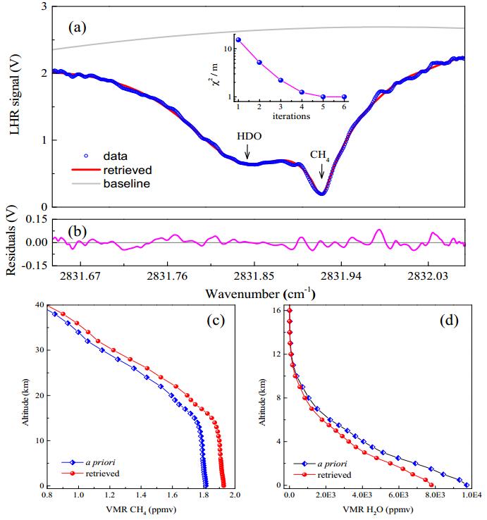 红外激光外差光谱技术具有光谱分辨率和垂直空间分辨率高、采样速度快、体积小、功耗低、散粒噪声极限探测灵敏度等优点,在大气卫星遥感探测、天文观测等领域具有重要的应用前景。课题组谈图副研究员、王贵师副研究员等人以3.53μm带间级联激光器作为本振光源,建立了0.003cm-1光谱分辨率的大气甲烷及水汽地基被动激光外差探测系统,获得了高光谱分辨率的光谱数据,并基于最优估计算法(OEM)及参考正向模型(RFM)建立了大气温室气体廓线反演模型,利用测量数据获得了大气甲烷和水汽的垂直廓线,以及甲烷气体柱总量及干空气混合比。