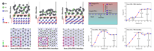 结构钢/液态金属锂铅界面结构(左)及各晶向界面铁原子的迁移能垒(右)