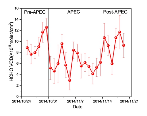 HCHO在大气光氧化反应中扮演着重要作用,作为活性气体,HCHO光解产生HO2自由基;HO2快速与NO发生反应生成OH自由基,从而影响大气的氧化能力。对流层甲醛的来源主要包括一次直接排放和二次生成,除了人为排放,还有很小一部分HCHO来自植被的直接排放。因此,研究HCHO对于研究OH自由基以及二次有机气溶胶的形成具有重要意义。2014年APEC会议在北京怀柔区举行。为了改善APEC期间空气质量,京津冀及周边地区实施了“APEC会议空气质量保障政策”,北京以周边地区实施了不同程度的减排措施。APEC峰会为研究环境质量与污染物排放之间的关系提供了机会。