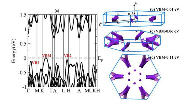 图1. (a) AgBiSe2的能带结构。能量为(b) VBM-0.01 eV, (c) VBM-0.06 eV, (d) VBM-0.11 eV费米能等面。