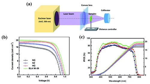 图2 (a)准分子激光对GZO薄膜进行退火时的光路示意图;基于准分子激光退火GZO薄膜的PSCs与基于其它处理方式GZO的PSCs的(b)J-V和(c)IPCE曲线对比。