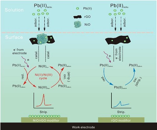 图1. 基于NiO/rGO 纳米复合材料优异吸附性能及表面Ni(II)/Ni(III)灵敏检测Pb(II)的示意图