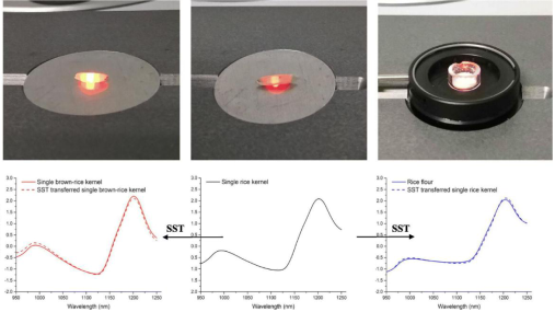为此,吴跃进课题组科研人员提出了一种基于模型转移的优化方法的单粒近红外检测技术,并以单粒水稻的蛋白质含量检测为例探索了该方法的应用。模型转移通常常应用于不同仪器间的光谱校正,在该研究中被创新地应用于解决单粒检测问题。课题组通过一种模型转移算法——光谱空间转换(SST),将单粒水稻光谱转移成单粒糙米、米粉的光谱形态,并使用单粒糙米、米粉模型进行预测。经过SST算法转移后的光谱和真实光谱形态相似,预测结果和转移之前接近甚至更好。因而在单粒作物的近红外光谱分析时遇到的困难,有望通过该方法转移成该作物其他形态的光谱来克服。该方法丰富了单粒作物光谱检测手段,有望在更多的单粒作物的成分检测上获得推广应用。