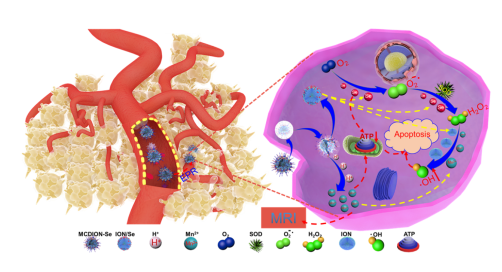近年来,多种化疗药物广泛应用于肿瘤治疗。然而,由于化疗药物昂贵的价格以及难以避免的副作用,导致其在临床上的应用受到限制。针对以上难题,研究团队利用纳米硒与碳酸锰修饰四氧化三铁构建了一种不含化疗药物的纳米诊疗剂。该诊疗剂中的碳酸锰在肿瘤组织的弱酸微环境中溶解,释放出Mn2+离子,与纳米硒协同促进H2O2在肿瘤细胞中形成羟基自由基,诱导肿瘤细胞的凋亡。同时,Mn2+离子与纳米硒也可抑制肿瘤细胞内三磷酸腺苷的产生,进一步加速肿瘤细胞的凋亡。另外,释放的Mn2+离子与磁性四氧化三铁携手赋予该诊疗剂对肿瘤组织特异性响应的磁共振双模成像功能。该纳米诊疗剂有望为探索肿瘤无药化及可视化诊疗途径提供新的借鉴。