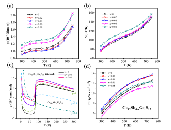 图1. (a) Cu12Sb4-xGexS13样品电阻率随温度的变化关系;(b) Cu12Sb4-xGexS13样品Seebeck系数随温度的变化关系;(c) Cu12Sb4-xGexS13样品磁化率与温度的变化关系; (d) Cu12Sb4-xGexS13样品功率因子随温度的变化关系。