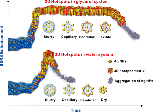 前期,杨良保研究员课题组通过溶剂蒸发诱导纳米粒子自组装,发展了一种动态表面增强拉曼光谱(D-SERS) 方法——利用溶液蒸发过程中形成的三维热点矩阵,实现SERS的高灵敏响应。然而,由于水溶液蒸发速率快速,导致三维热点存在时间短,稳定性差。因此,针对这些问题,杨良保研究员等提出了一种利用甘油构建长周期、高稳定表面增强拉曼三维热点矩阵的方法。该方法使三维Ag NPs热点矩阵数量增加,SERS检测灵敏度大大提升,实现了纳摩尔水平海洋生物毒素、农残、毒品等的高灵敏、稳定检测。构筑的长周期、高稳定三维热点,减少了由水体系热点存在时间短而引起的偶然因素的发生,使实验更具可操作性,在实际犯罪现场分析、医学诊断、食品安全等诸多领域的应用前景更加广阔。