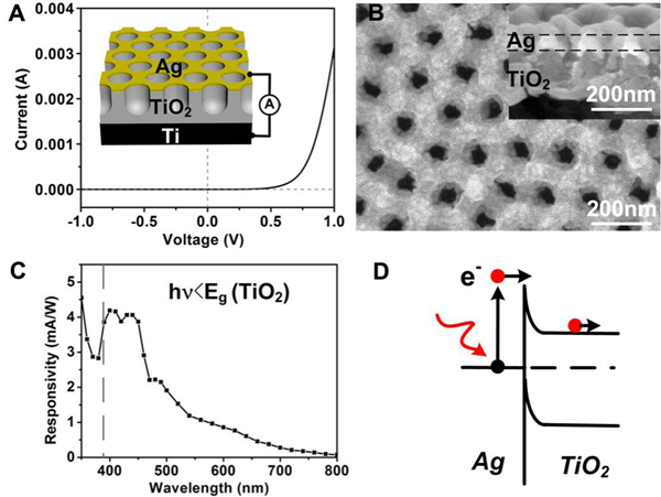 图1. 探测器的结构和等离热电子参与的光响应过程。(A) 孔阵列银/氧化钛复合膜在真空条件下的肖特基型电流-电压曲线。(B) 银/氧化钛复合膜的SEM照片。(C) 孔阵列银/氧化钛探测器的光谱响应。(D) 等离热电子参与光电流响应的能带示意图。