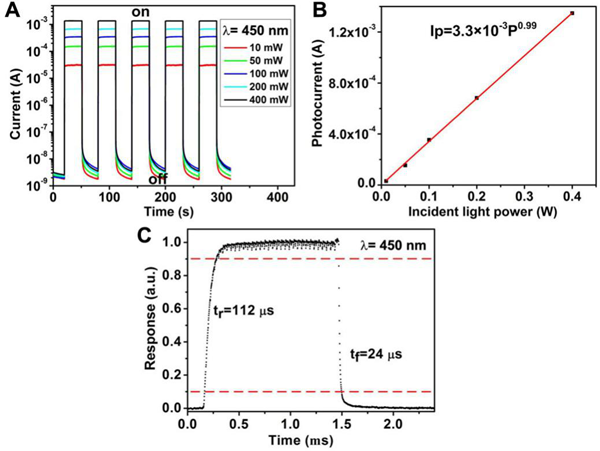 图2. 波长450 nm的光照射下的光电流响应。(A) 器件在零偏压条件下,对不同功率的脉冲入射光的响应。(B) 光电流-光强的关系。(C) 归一化的单脉冲光电流响应。