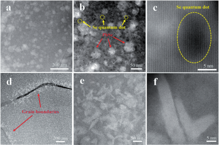 课题组发现,磁场下合成的样品的Seebeck系数大幅提高(图3a),这主要归因于Se量子点的出现引起电子结构的变化。紫外光电子能谱(UPS)测量表明,Se量子点导致费米能(Ef)附近具有更大的电子态密度,从而提高了材料的Seebeck系数和功率因子。另一方面,磁场下合成的样品中Se量子点、更小的晶粒尺寸、纳米析出相使其具有极低热导率。通过强磁场调控热电材料的电声输运,使得磁场下合成的样品热电优值显著增加,最大ZT约为2.0,与零场下制备的样品相比,最大增幅达到了47%,证明了强磁场是提高热电性能的有效手段。
