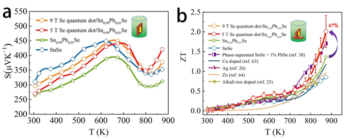 图3 不同磁场下合成Sn0.99Pb0.01Se样品的Seebeck系数(a)和热电优值ZT(b)