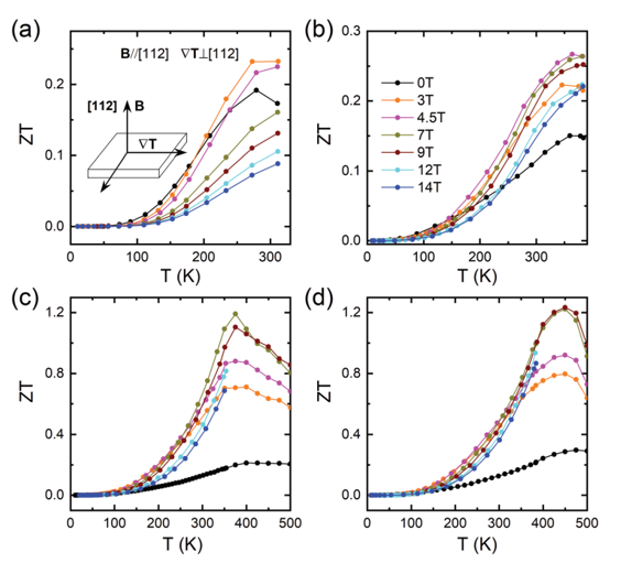 不同载流子浓度的Cd3As2单晶ZT在磁场的剧烈提升