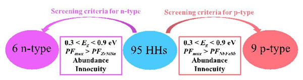 图1. 高通量搜索比NbFeSb (ZrNiSn) 电学性能更好的p (n) 型母体HH候选材料的流程图 。