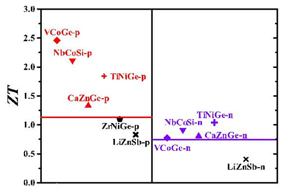 图2. 900 K 下理论计算的HH候选材料的ZT值。红线和紫线分别代表理论计算p型NbFeSb和n型ZrNiSn的ZT值。