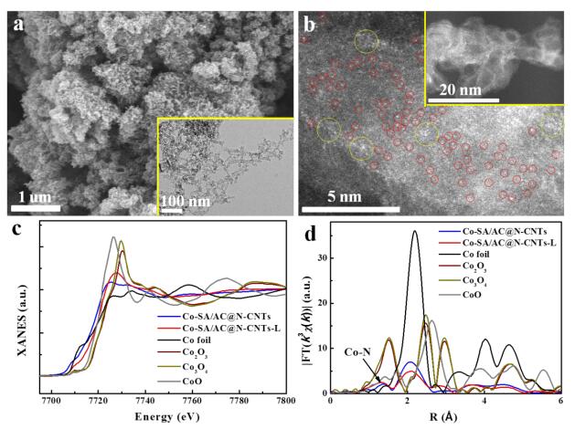 图2. (a) 激光辐照处理的Co-SA/AC@N-CNTs-L材料SEM图和TEM图,(b) AC HAADF-STEM和HAADF-STEM图,(c) XANES和 (d) EXAFS谱图。