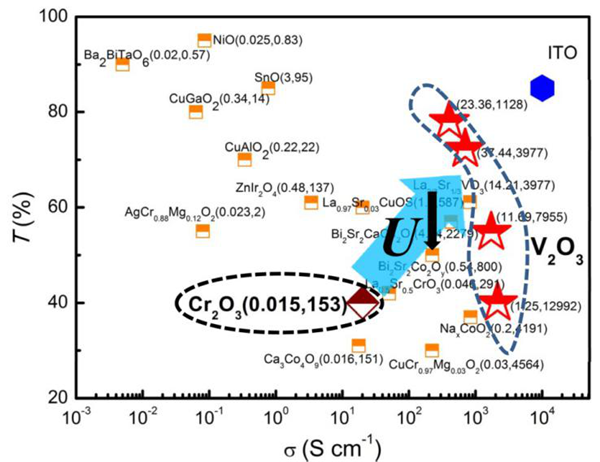 为此,研究人员从材料电子结构的角度出发,提出了在关联氧化物中利用由电子间库仑相互作用所导致的电子关联来探索高性能p型TCO的思路:一方面,电子关联将导致其价带由过渡金属离子的d轨道组成或者与O 2p轨道杂化组成,保证了材料的p型导电性;另一方面,由电子关联导致的载流子有效质量的增大将有利于在可见光区打开透明窗口。因此,电子关联可以作为探索高性能p型TCO材料的关键参数。基于上述想法,研究人员发现在电子关联强度较小的V2O3薄膜中可实现p型导电性和光学透明性的良好平衡。不同厚度的V2O3薄膜在保持良好导电性(400-2122Scm-1)的同时具有较高的可见光区透过率(40%-78%),其透明窗口为0.97-3.6eV。上述结果表明:关联氧化物中电子关联强度的调节是探索高性能p型TCO材料的有效途径。