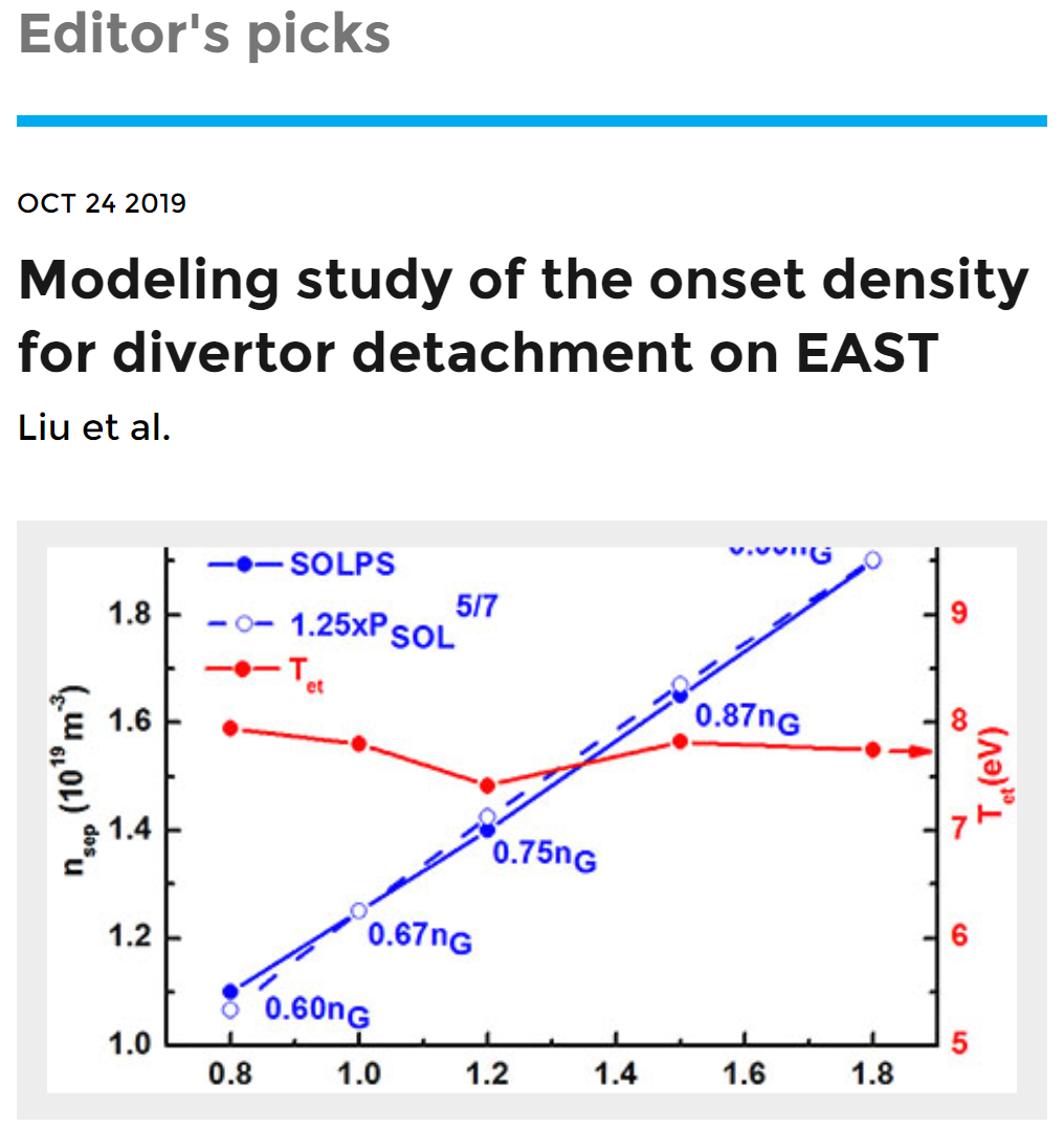在托卡马克长脉冲高功率运行中,中心高性能等离子体排出的大量热和粒子将穿过闭合磁面,沿磁力线最终到达偏滤器靶板。靶板的极高热负荷及其引起的等离子体与壁强烈相互作用是当前磁约束聚变装置及未来聚变堆稳态运行面临的严峻挑战。等离子体脱靶可以有效降低偏滤器靶板表面的热沉积和材料腐蚀,是国际上普遍认可的未来聚变堆最有前景的偏滤器运行状态。近期,等离子体所EAST团队相关科研人员经过不断探索,在ITER-like钨偏滤器条件下实现了高约束H模脱靶运行,通过实验和模拟等手段揭示了影响H模脱靶的相关物理机制。相关研究成果分别由刘建斌助理研究员、刘晓菊副研究员相继发表在国际聚变领域权威期刊Nuclear Fusion和Physics of Plasmas上,其中刘晓菊副研究员对EAST偏滤器脱靶阈值的模拟研究成果还被PoP期刊评为编辑精选论文(Editor's Picks)。