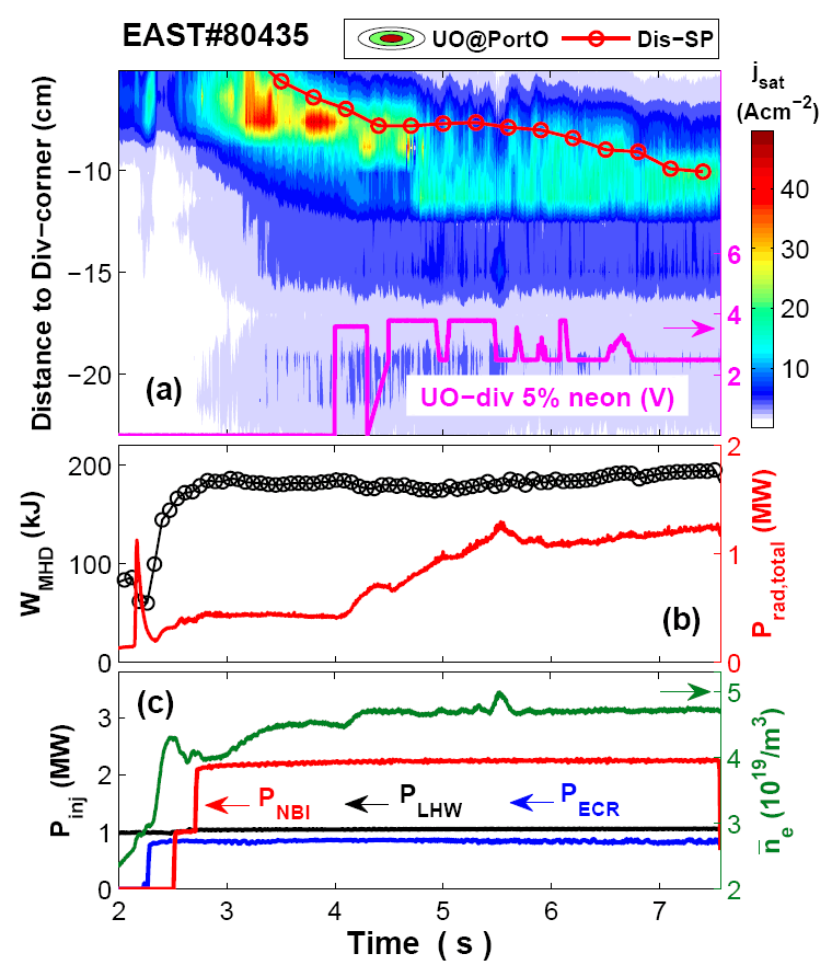 在偏滤器脱靶状态下,伴随着增强的原子分子过程带来偏滤器区域强烈的能量损失,靶板表面可以实现较低的等离子体温度,进而缓解偏滤器表面材料的损伤和杂质的产生,但深度脱靶易使偏滤器区域粒子特别是杂质返流进入主等离子体。国际上一些其它主流托卡马克装置一直难以在长脉冲H模运行下验证稳定脱靶模式,而对于未来聚变堆,如何稳定可靠地获得这种运行模式,是亟需解决的问题。EAST团队王亮研究员等偏滤器物理、等离子体控制、运行、诊断等相关科研人员通力协作,利用EAST当前特有的长脉冲运行能力,针对高功率长脉冲稳定脱靶运行的相关物理机制开展了深入详细的实验和理论模拟研究。在2018年袁旗平项目研究员等实现辐射功率主动反馈控制的基础上,近期将偏滤器探针诊断数据作为实时反馈控制信号,在EAST上通过偏滤器区域注入微量杂质气体或提升主等离子体密度分别实现了稳定重复的H模脱靶运行及其主动控制,发展出了多种主动反馈控制H模脱靶的实验方法,在EAST上系统验证了脱靶与中心高性能等离子体的兼容性。