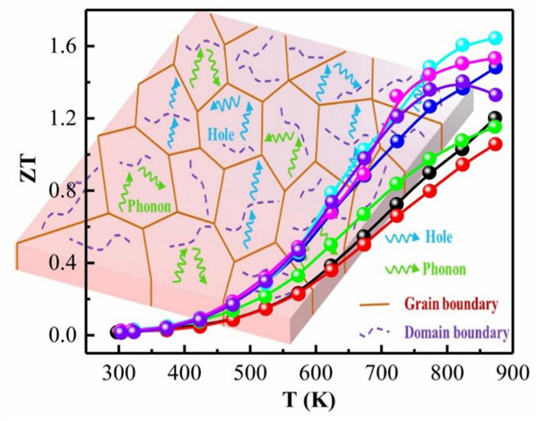 图1. 畴结构在黄铜矿样品中的分布及其对电声输运调控的示意图和复合体系Cu1-xAgxGa0.4In0.6Te2的热电优值ZT与温度对应关系。