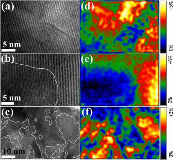 图2. 复合物样品的高分辨图像及GPA应力分析显示出畴区及畴界的分布。