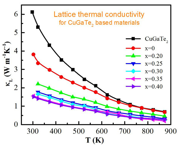 图3. 复合体系Cu1-xAgxGa0.4In0.6Te2 (x=0, 0.20, 0.25, 0.30, 0.35, 0.40)的晶格热导率随温度变化曲线。