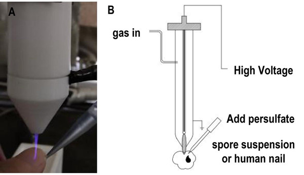 低温等离子体激活过硫酸盐治疗甲真菌病的照片(A)和示意图(B)