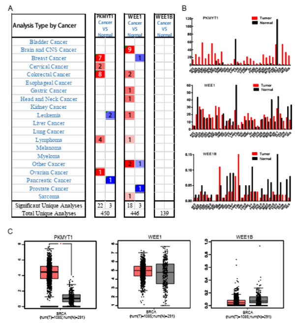 癌细胞在很大程度上依赖于WEE家族激酶的G2检查点机制来维持基因组的完整性。之前的研究表明,WEE家族激酶与乳腺癌的发生有关,但临床应用非常有限。研究团队使用一套生物信息学工具对WEE家族激酶的表达进行了综合分析,发现PKMYT1是唯一在不同亚型乳腺癌中频繁过表达的成员。PKMYT1异常高表达预示预后不良,尤其是某些亚型,如luminal A/B和triple negative (TNBC)型。此外,PKMYT1的上调与HER2阳性(HER2+)、基底样(basal-like)、TNBC状态以及Scarff、Bloom和Richardson (SBR)分类有关。共表达分析显示,PKMYT1与Polo-like kinase 1 (PLK1)具有很强的正相关关系,提示PKMYT1与PLK1协同作用以同步化细胞快速周期和高质量的基因组维护来协同调控癌细胞的增殖。综上所述,PKMYT1在乳腺癌中经常出现过表达,且预测预后不良,提示PKMYT1是一种具有吸引力的乳腺癌治疗靶点,未来可针对其发展特异抑制剂或其它干预方案,为乳腺癌靶向治疗研究提供了新方向。