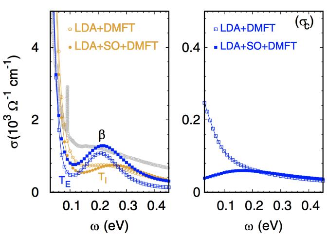 针对这些问题,研究人员采用自己开发的、能够同时精确处理真实晶体结构、晶体场劈裂、自旋-轨道耦合和全部库仑顶角的LDA+SO+DMFT方法,在前期工作的基础上,详细研究了晶体场、库仑作用及自旋-轨道耦合对Sr2RhO4费米面拓扑结构的影响。基于精确的LDA+SO+DMFT计算结果,他们进而用线性响应理论详细研究了各种因素对光电导的贡献。结果表明,库仑增强的自旋-轨道耦合确实对费米面的有重要影响,但是之前的平均场计算夸大了这种效应。并且与平均场结果不同的是,库仑相互作用对晶体场的增益几乎可以忽略,甚至可能是负值。而对于光电导,只考虑关联作用就可以得到中红外区域的峰,说明自旋-轨道耦合不是其起源。但是自旋-轨道耦合增加了它的强度。有意思的是,对光电导的详细分解表明光电导中主要的成分即不是来自于带间也不是来自于带内的贡献,而是来自于速度矩阵和格林函数矩阵的非对角部分。这种多带效应说明基于单带近似的经验光电导公式并不适用于Sr2RhO4。