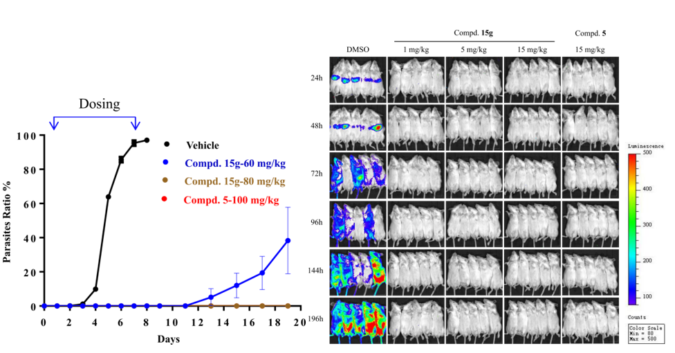 在抗疟疾药效学实验中,该药物表现出了良好的剂量依赖关系,并且在80mg/kg剂量下能够全部清除红内期疟原虫感染,在 1mg/kg剂量下能够全部清除肝内期感染,这表明,CHMFL-PfPI4K-127同时具有潜在的治疗和预防抗疟的作用。
