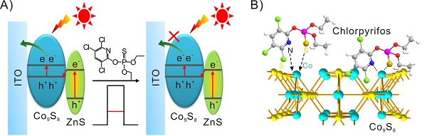A)基于Z型光催化材料ZnS/ Co9S8的光电化学传感器载流子的传递方式示意图;B) 高选择性检测的机制:毒死蜱农药与Co9S8 材料的特异性结合