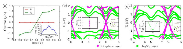 为此,郑小宏研究员课题组基于具有面外极化的二维铁电材料的两个表面具有不同功函数的特点设计了具有范德瓦尔斯垂直异质结构(石墨烯/In2Se3)的2D FTJs。通过密度泛函理论结合非平衡格林函数方法计算,获得了1×108%的巨大TER比率,这比目前大多数3D FTJs的TER比率都要高。原因在于In2Se3层两个表面的功函数之间存在较大差别(约2.396 eV),而石墨烯的功函数与其中一个表面的功函数接近。因此,当石墨烯与其不同的表面接触时,石墨烯将表现出向In2Se3转移或不转移电子,从而使得In2Se3表现出导电和不导电两种不同的状态。相关研究表明,对于具有面外铁电极化的2D铁电材料,可以通过仅考虑功函数来方便地设计高性能2D FTJs。同时也表明,二维铁电材料,特别是具有面外极化的铁电材料,在构造二维铁电隧道结,实现巨电致电阻效应以及铁电存储方面具有重要的应用潜力。