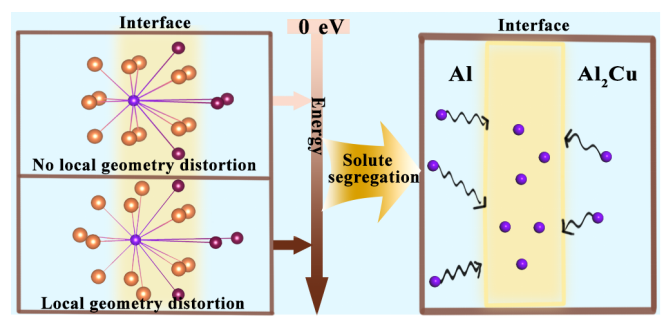 图1. 界面处几何结构畸变对溶质偏析影响的示意图。