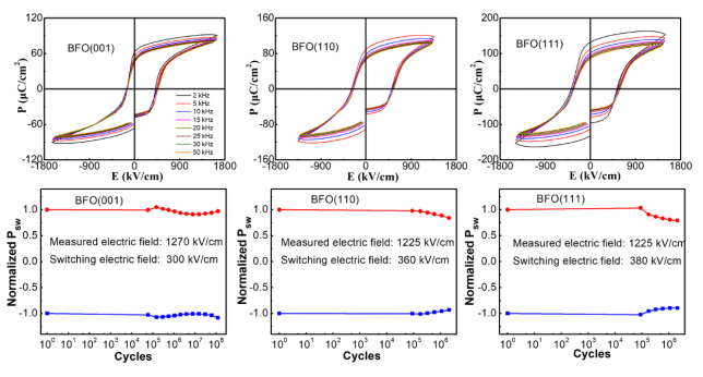 采用全化学溶液法制备的不同外延取向的BFO薄膜铁电性能相关结果。