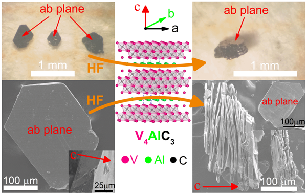 图1. 氢氟酸刻蚀V4AlC3单晶(左图)为V4C3Tx MXene(右图); V4AlC3晶体结构示意图(中图)。