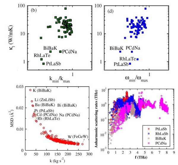 (c) 每个原子的弹簧常数与平均有效位移的平方的关系;(d) 四种具有较低晶格热导率材料的声子频率与声子的非谐散射率的关系。