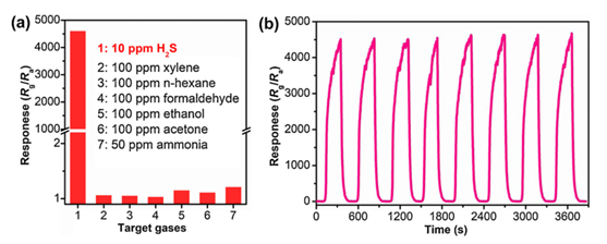 在160℃下CuAlO2传感器对10 ppm H2S的(a)选择性和(b)可重复性