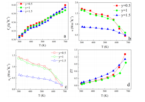 图2. Cu3Sb0.94Sn0.06Se4?ySy(y=0.5、1和1.5)随温度相关的(a)比热;(b)热导率;(c)晶格热导率;(d)ZT值。