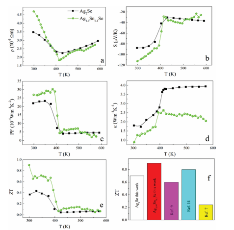 近期,中科院合肥研究院固体所材料应用技术研究室秦晓英研究员课题组提出了一种简便的制备β-Ag2Se基合金的方法。在317K时,β-Ag2Se的最大热电优值为0.7。进一步采用Sn掺杂,来改善β-Ag2Se的电学和热学性能,使得β-Ag1.9Sn0.1Se在300K时ZT峰值达到0.9,多次重复测试结果表明,Sn掺杂是提高β-Ag2Se热电性能的有效途径。相关研究成果发表在Materials Chemistry Frontiers上。