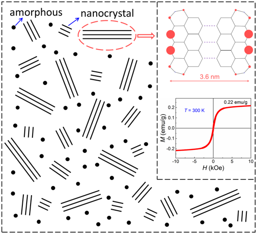 通过合作研究,项目组用武兹反应合成内嵌石墨纳米晶的无定形碳纳米片,并发现由石墨纳米晶的锯齿形边界(zigzag edge)引起的室温铁磁强度可达0.22emu/g,比此前报道的点缺陷诱导的石墨室温铁磁强度大两个数量级。结合进一步的实验和第一性原理计算,研究人员发现碳纳米片的磁性主要依赖于锯齿形边界间的距离,随着距离由3.6nm减小0.8nm,边界间的磁性耦合由铁磁转变为反铁磁。室温铁磁性是二维磁性材料走上应用的前提,这些发现为碳基磁性材料的应用提供了可行性。