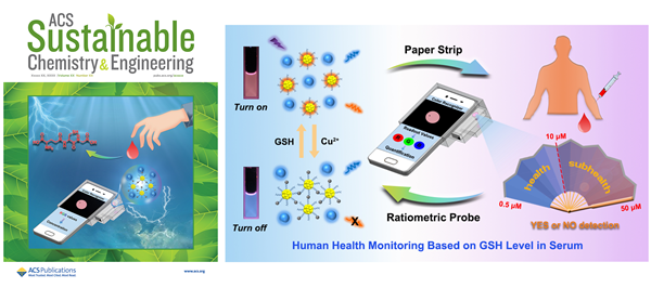 1. 基于比率荧光试纸的智能手机传感平台对血清中谷胱甘肽水平的监测用于人体健康预判示意图及期刊封面。
