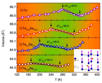 磁性金属间化合物材料CrTe具有较高的相变温度(TC~340 K),并且可以通过Cr的空位对其进行调控。当Te的含量在52.4%到53.3%之间,体系保持NiAs型的结构,表明Cr空位对稳定这一结构非常重要。在相变温度附近的区间,其晶格参数会偏离正常的热膨胀规律,表现出明显的NTE现象。最近的研究发现:Cr和Te存在晶格-自旋耦合;交换作用和原子距离之间也存在密切关系。本研究中,科研团队通过Se替代Te来引入化学压力,从而对该体系的磁性和NTE进行有效的调控。