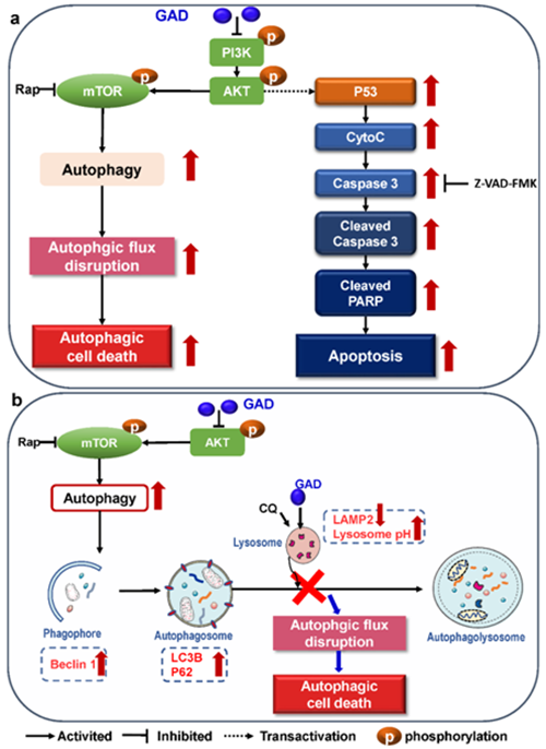 图5:a:灵芝酸诱导食管鳞癌细胞凋亡和自噬性细胞死亡的总示意图 b:灵芝酸阻断自噬流造成自噬性细胞死亡的示意图
